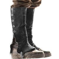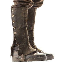 These spats are made from durable brown duck cloth to ensure a long life of comfort and style. They measure 17 inches long, 19 inches at the widest part of the calf, 16.5 inches at the ankle and are worn from below the knee to the ankle. They are a size large and meant to be worn with pants to keep them tight. Secures to your boot with a strap and buckle.