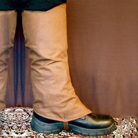 These spats are made from durable brown duck cloth to ensure a long life of comfort and style. They measure 17 inches long, 19 inches at the widest part of the calf, 16.5 inches at the ankle and are worn from below the knee to the ankle. They are a size large and meant to be worn with pants to keep them tight. Secures to your boot with a strap and buckle.