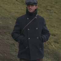 This enduring, protective coat that references original Royal Navy styles. Our classic storm-collar Pea coat is made in London from a warm 900gsm pure rustic wool fabric and is finished with gabardine sealed seams, matte horn buttons with marble finish and tall collar.