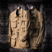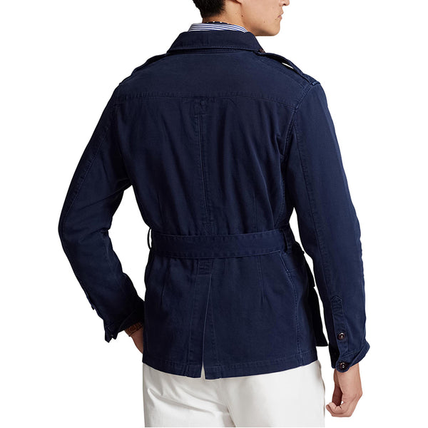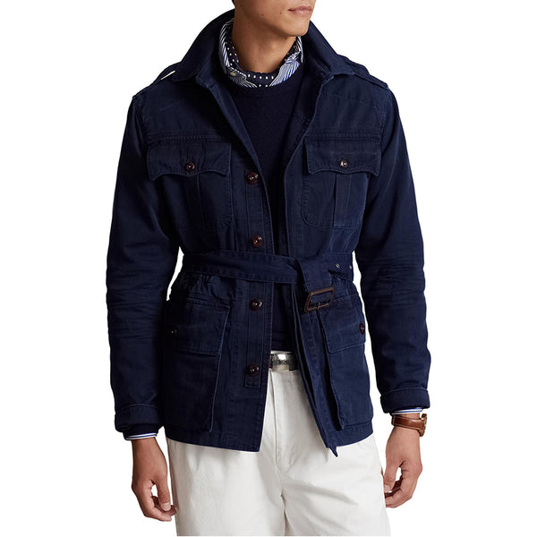 Based on an archival model, belted jacket is crafted of a vintage-inspired cotton fabric. Button-through flap pockets adorn this button-front piece at the chest and sides.