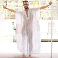 This Neutral Tribal Striped Kaftan Coverup, is an exotic and versatile loose-fitting outerwear piece, and is the perfect blend of bohemian style and modern simplicity.