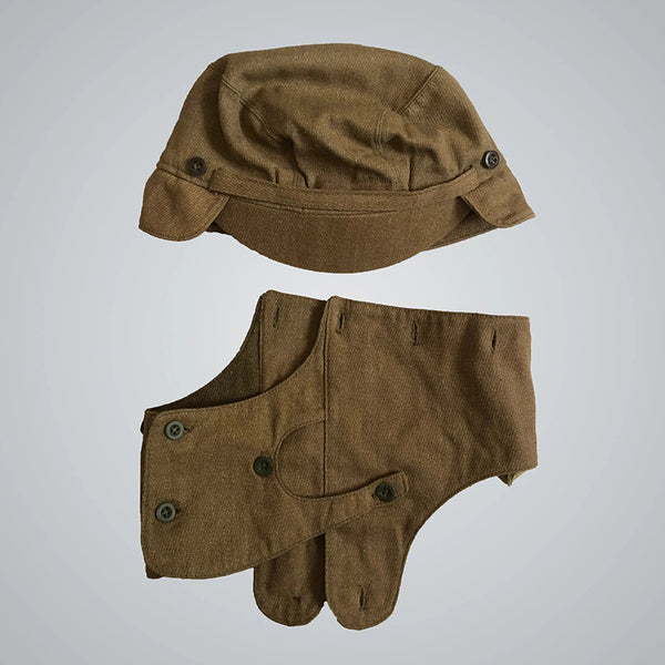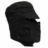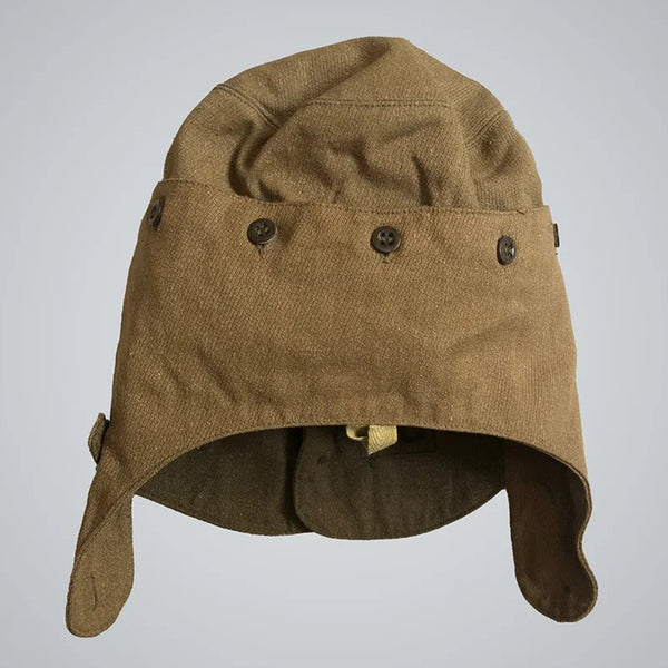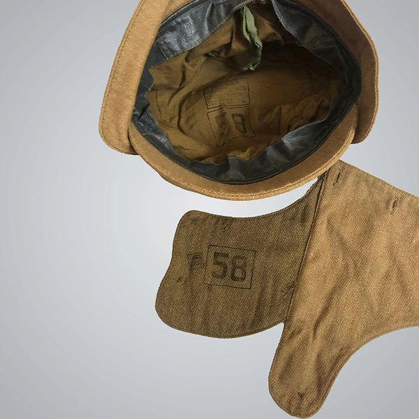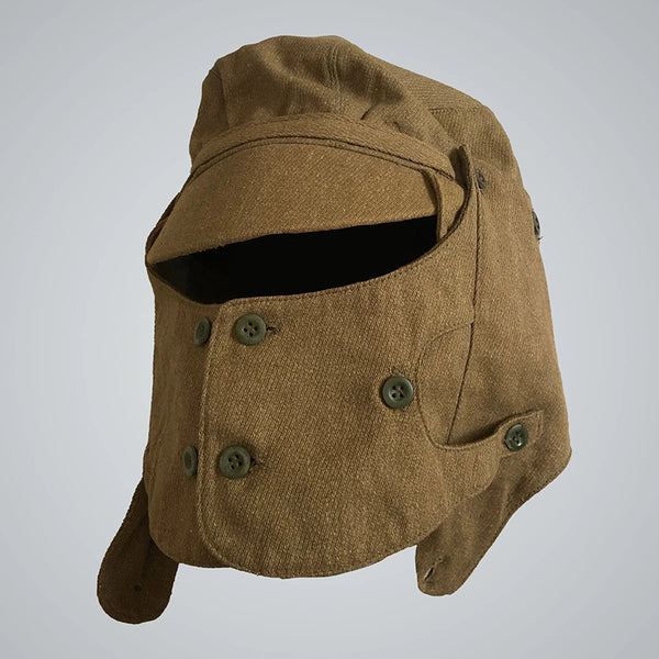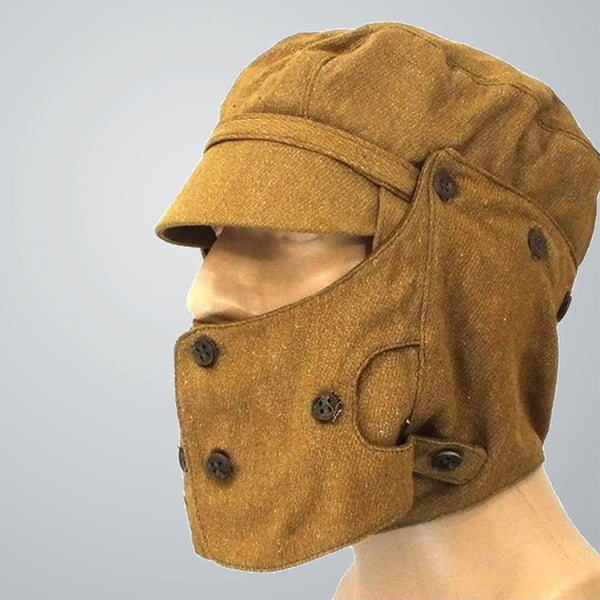 An important part of that uniform is the headgear seen here.This “hat” is a more complicated and multifunctional version of the classic winter cap with ear flaps. It features detachable flaps, an adjusting bottom strap, a hole for the gas mask filter/tube, 2 rows of buttons to accommodate the mask, and a special visor.