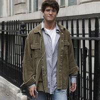 Corduroy is a strong durable fabric with a rounded cord, rib, or wale surface formed by cut pile yarn. The back of the goods has a twill weave. We used a cotton with added stretch fabric for its comfort and recoverability. This shacket has all the right details for a staple piece.