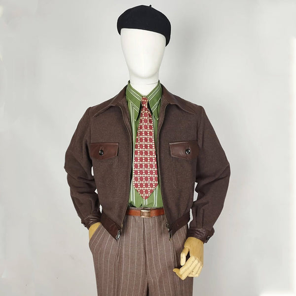 Step back in time with this exquisite 1930s-inspired wool jacket, crafted with meticulous attention to period details. Made from heavy, warm wool and accented with genuine leather on the collar, pocket flaps, cuffs, and waistband, this piece embodies the refined masculinity of pre-war menswear.