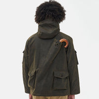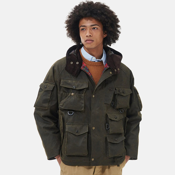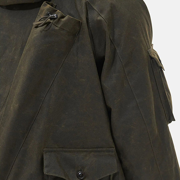 It is inspired by classic fishing jackets. This 8oz waxed cotton jacket offers a weatherproof design that features classic raglan sleeves to protect water from seeping through the seams, while a multitude of practical pockets to the front and back of this silhouette offer a special spot for each of your tools and equipment."