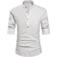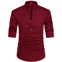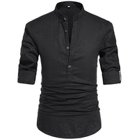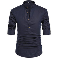 Casual henley shirts, Roll-up Sleeves, Long Sleeve linen shirts, Button Front, Stand collar, featured button detail.