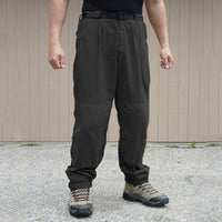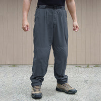 Double reinforced seat and diamond shaped gusseted crotch as found in rock climbing pants for free range of motion.