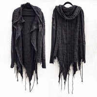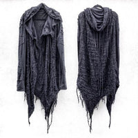One of a kind handcrafted distressed asymmetric hooded cardigan.