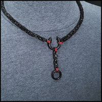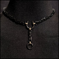 The day collar features a black spike top torc with colored halos (connector rings) on a durable black finish stainless steel Borobudur pattern byzantine design chain. A 2-inch drop chain is included as shown in the images. There is a larger lobster claw clasp centered behind the neck for easy on and off. The torc's spikes are not removable. The drop chain spring ring connector can be opened to attach things.